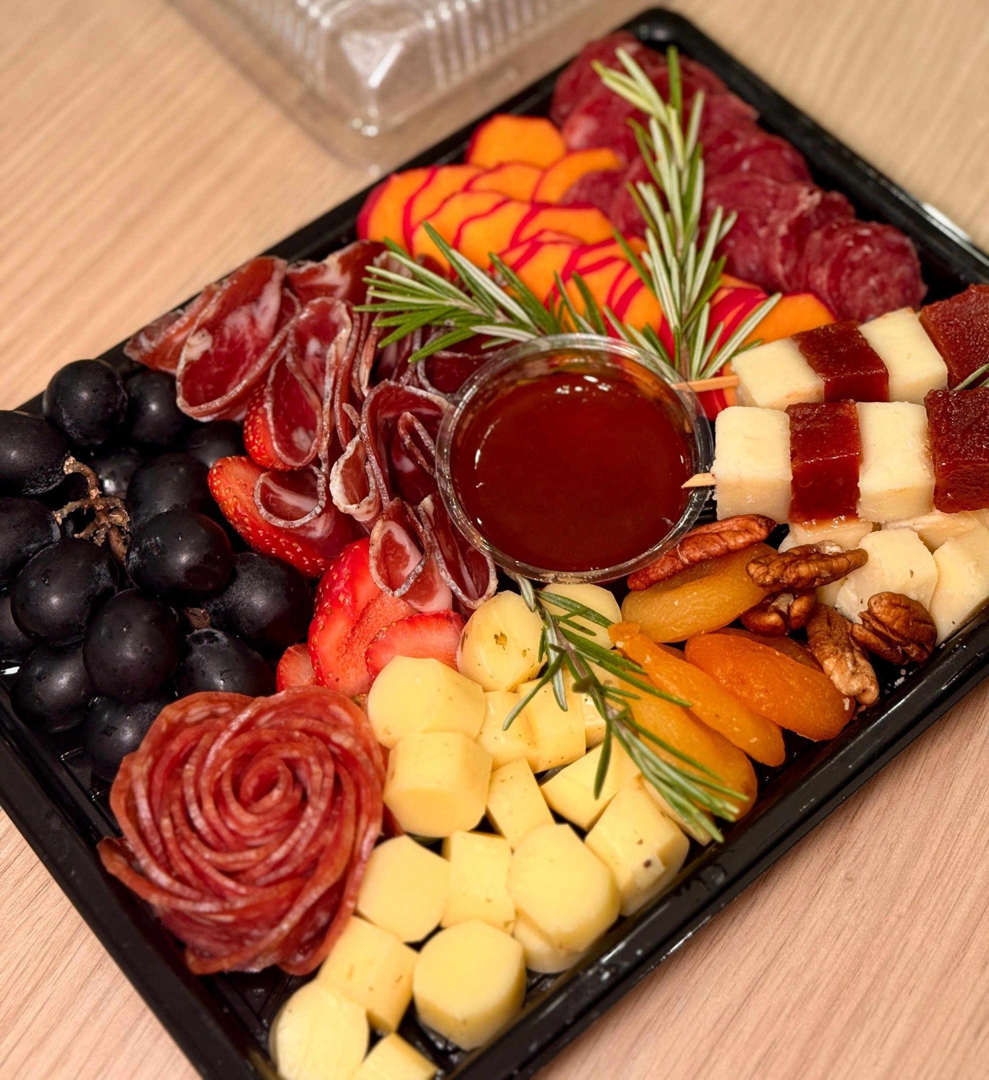 Acompanha: 3 tipos de queijos, 2 Tipos De Charcutaria, Geleia de pimenta defumada suave, 2 Tipos de frutas ( uva e morando), 2 Espetinhos Romeu e Julieta, Serve 2 pessoas para petiscas.